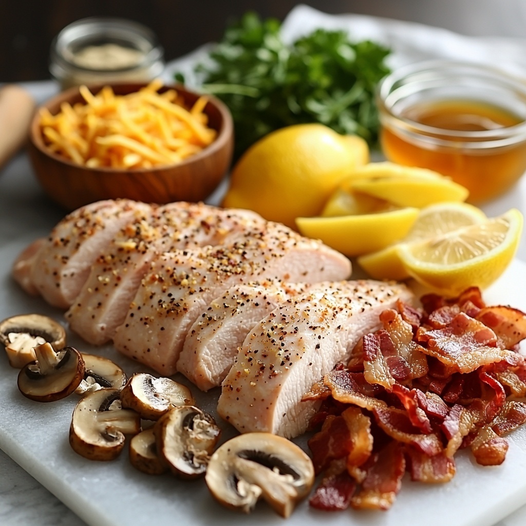 While the chicken marinates, cook the bacon in a skillet until crispy, then crumble it into bite-sized pieces. Use the same skillet to sauté the sliced mushrooms until they’re tender and flavorful, absorbing the bacon’s smoky essence. These two components elevate the dish with their contrasting textures and savory tastes.