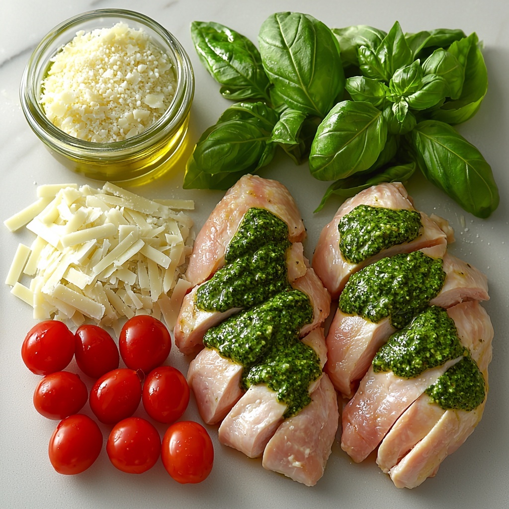 The beauty of this Baked Pesto Chicken Recipe lies in its simplicity and quality ingredients. Each element plays a crucial role, from the juicy chicken breasts to the aromatic pesto and rich cheeses, creating a colorful and flavor-packed dish.