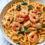 For a show-stopping presentation, plate the pasta in shallow bowls with a lobster fork alongside it, arranging the shrimp and chicken on top in a decorative way. Alternatively, serve the dish family-style in a large, rustic skillet for that cozy, welcoming vibe.