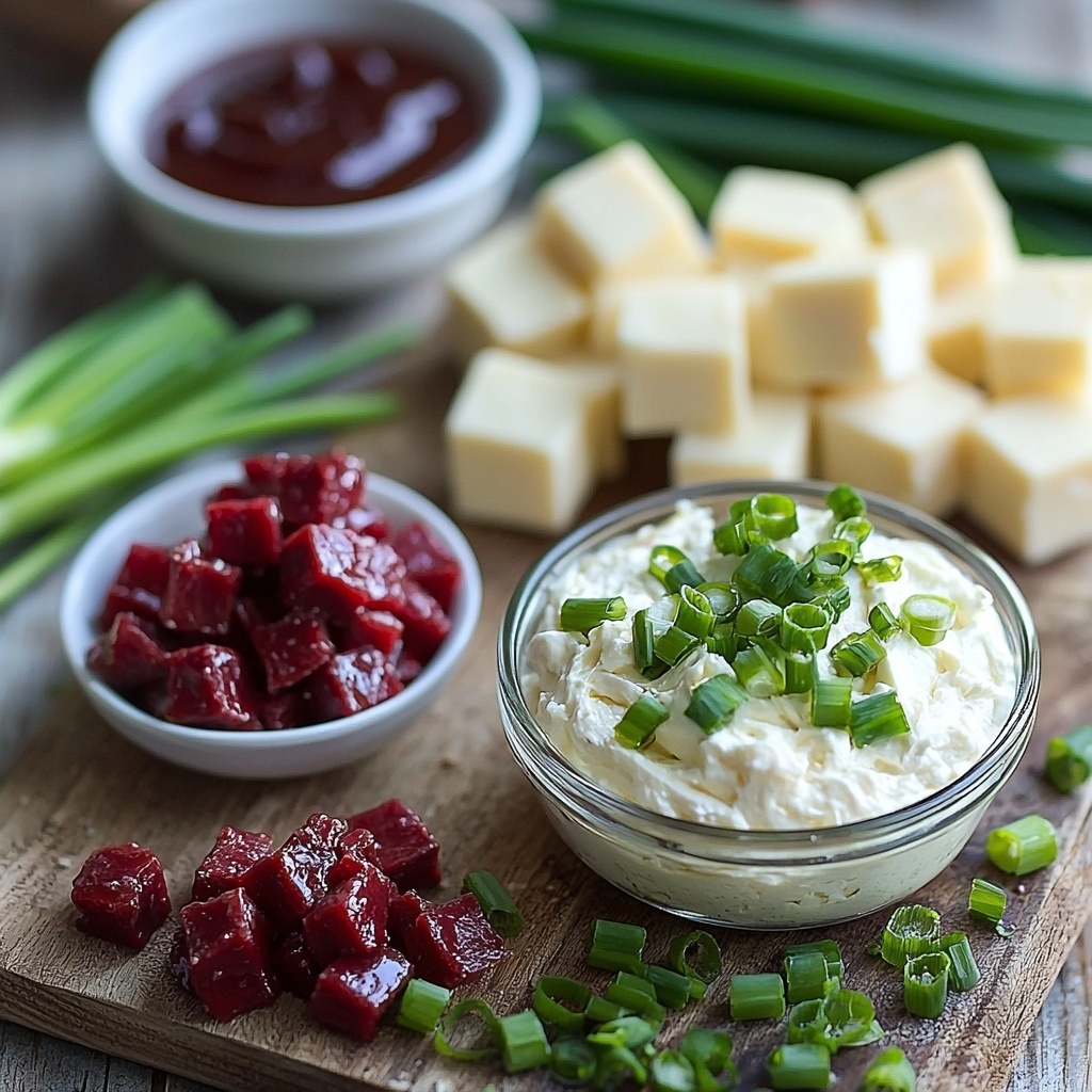 - Buddig beef (4 ounces, diced): The star ingredient, offering that salty, rich, and slightly smoky beefiness that makes this dip stand out.