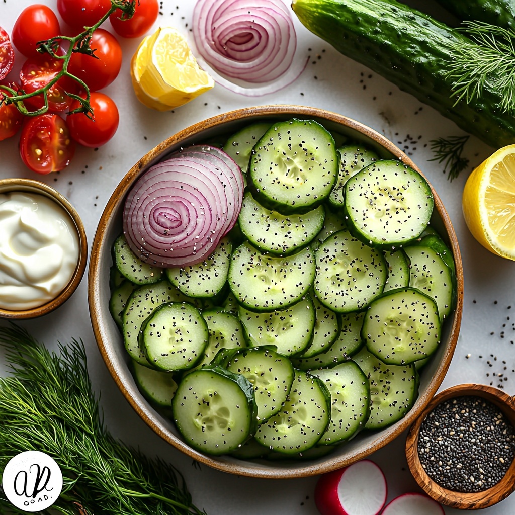 A refreshing and creamy cucumber salad tossed with tangy Greek yogurt dressing and flavorful everything bagel seasoning. Perfect as a light side dish or addition to a brunch spread, this no-cook salad combines thinly sliced cucumbers and red onions with fresh dill and a hint of lemon for a bright, satisfying bite.