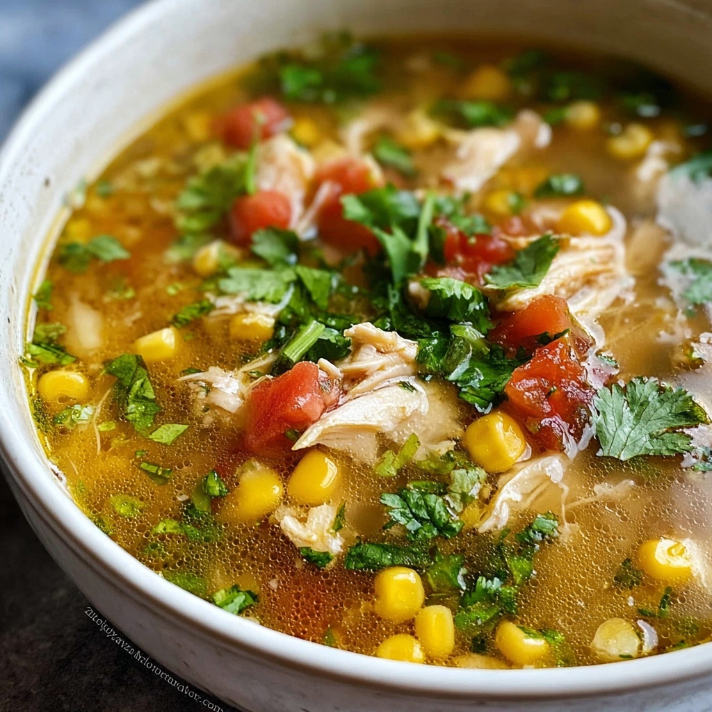 A hearty and flavorful Green Chile Chicken Stew featuring tender chicken thighs simmered with green chilies, corn, tomatoes, and aromatic spices. Perfect for a comforting meal with a mild spicy kick and fresh cilantro garnish.