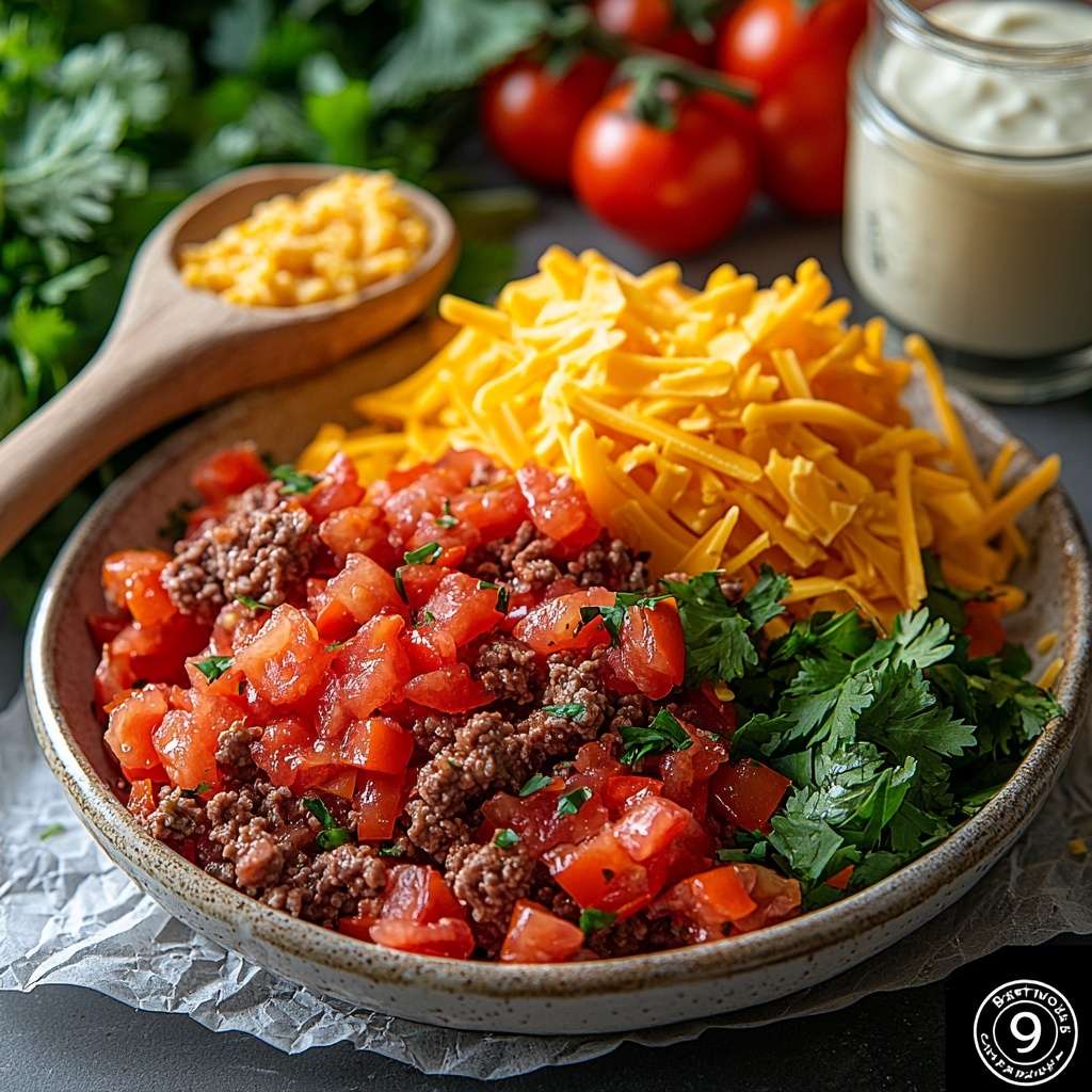 - Mix Cheese and Dressing: In a bowl, combine the shredded cheddar cheese with the ranch dressing, then mix in the seasoned beef until everything is well coated.