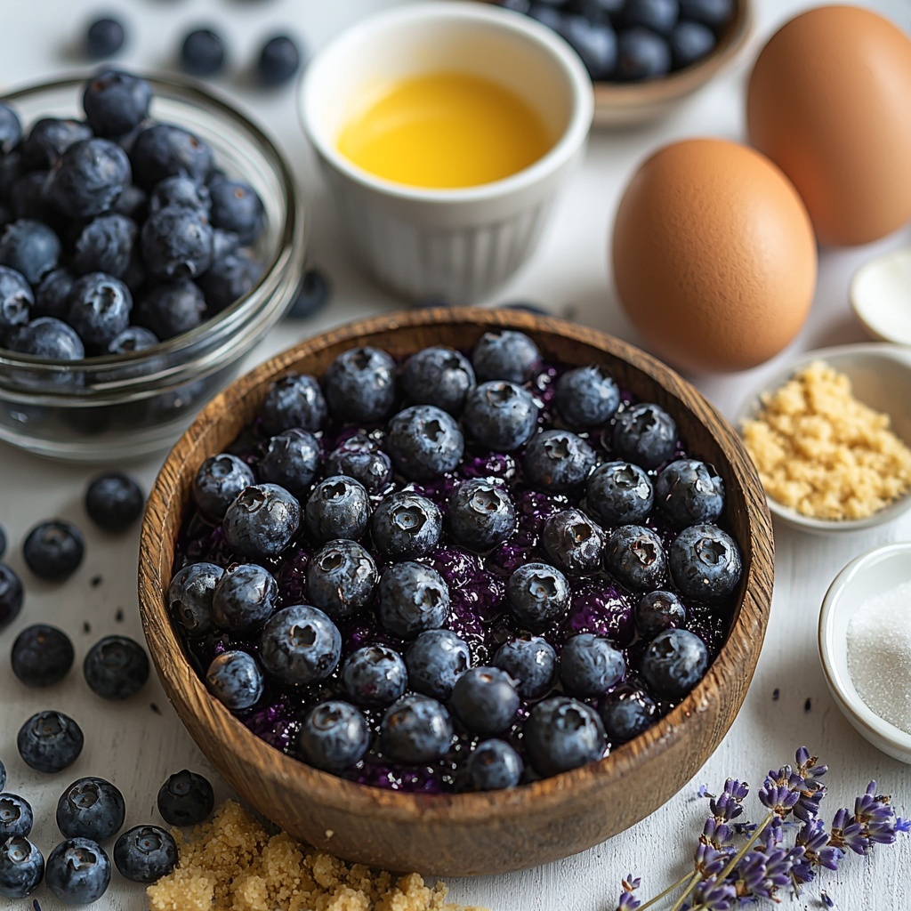 - Prepare Blueberry Lavender Compote: In a small saucepan over medium heat, combine the blueberries, 1/4 cup granulated sugar, lemon juice, dried culinary lavender, cornstarch, and water. Stir well and simmer gently until the mixture thickens, about 5-7 minutes. Remove from heat and let cool completely.