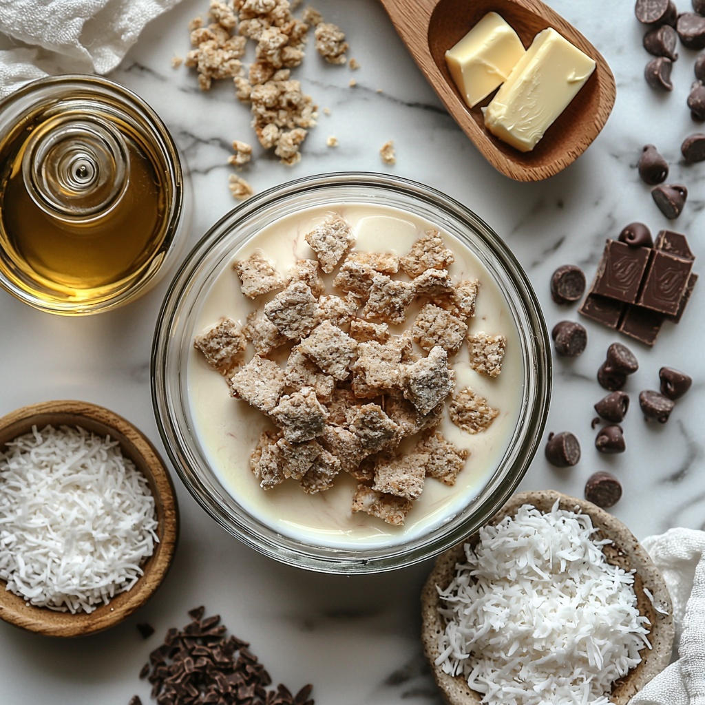 - Add Dry Ingredients: Gradually stir in the graham cracker crumbs, dried coconut, and chocolate chips. Mix everything together until all ingredients are evenly distributed throughout the mixture.